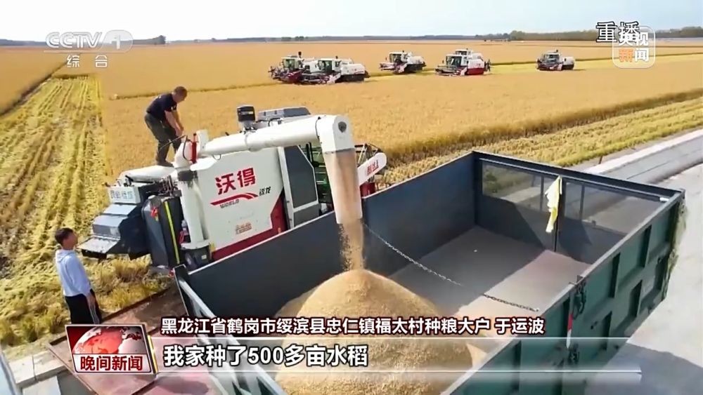 黑龙江省鹤岗市绥滨县忠仁镇福太村种粮大户于运波:我家种了500多亩水稻,今年现在正在收获中,产量比去年一垧地增加半吨。