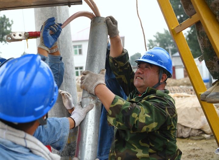 8月11日,国网邯郸供电公司抢修人员在抢修电力设施。新华社记者朱旭东摄