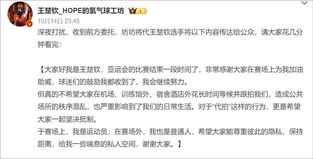 近日,国乒球员王楚钦在机场被跟拍怒怼“粉丝”的视频在网上热传。“希望大家能尊重彼此的隐私,保持距离,给我一些喘息的私人空间。”10月14日深夜,王楚钦发表声明,希望球迷能够理智看待运动员,一起抵制长时间跟拍和“代拍”等饭圈行为。