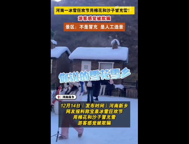 近日,河南新乡“宝泉冰雪狂欢节”引发众多质疑。多位网友称,他们前往这个被宣传为冬日雪景胜地的景区,却遭遇了令人失望的假雪景:脚下踩的“白雪”其实是白沙,树上和房屋上的“积雪”则是棉花代替……对此,景区回应称,活动未正式开始,目前展示的是人造雪景。但这一解释未能平息游客的批评之声。