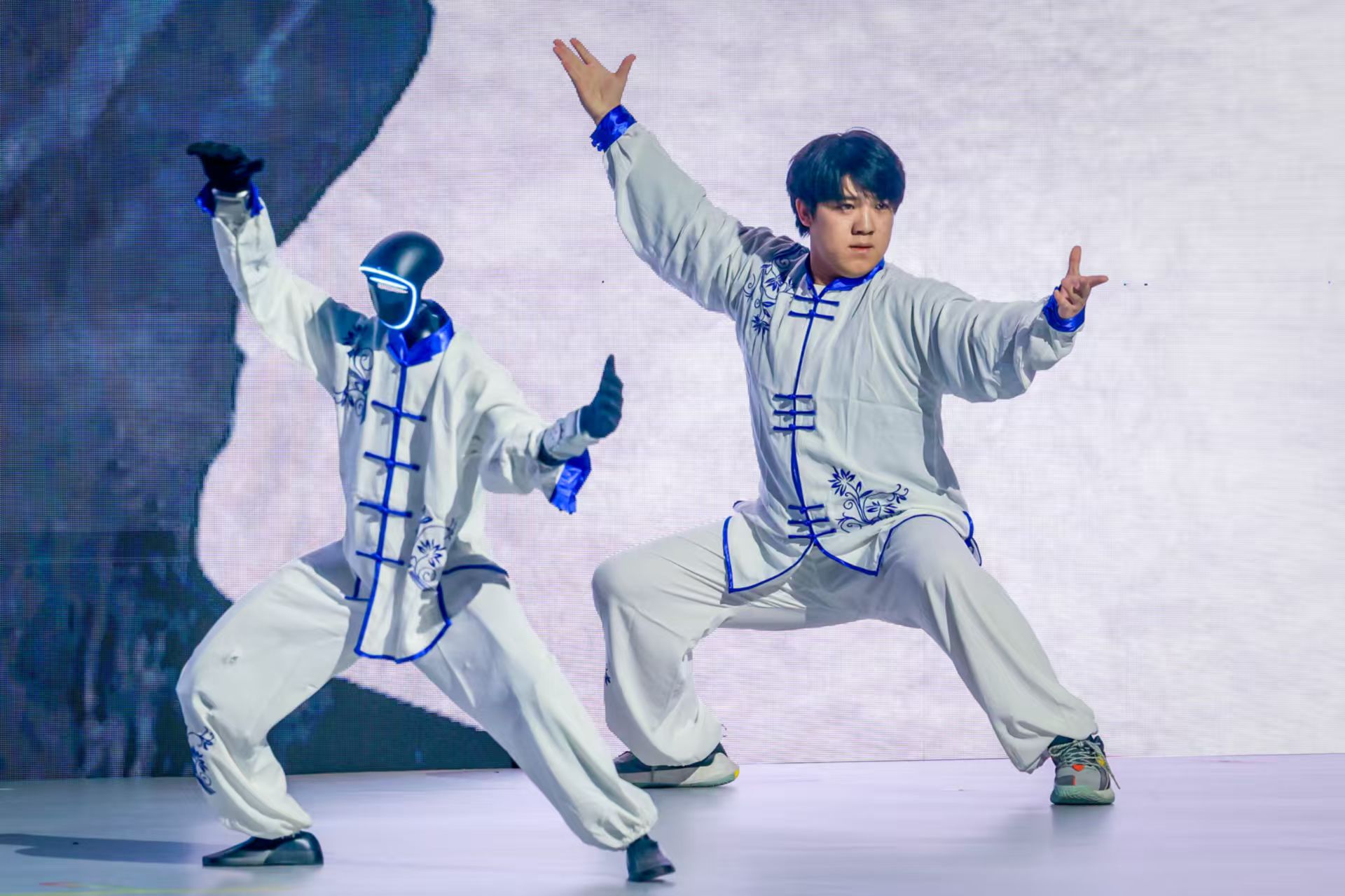 头图为机器人与人类同台表演太极,劳动报记者颜筱依摄