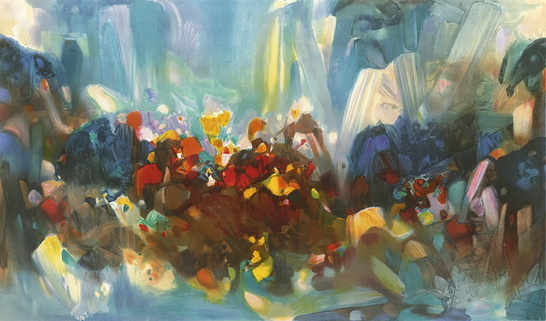 2002年5月,83岁高龄的朱德群在老朋友吴冠中的陪同下,感受了国际化大都市上海的新貌,并欣然接受邀约为上海大剧院度身创作了一幅油画巨作。期间时逢春天,朱德群试着用《第六交响曲》田园风光般的诗意去捕捉春天的韵律,使这幅作品有更多的抒情气质和旋律色彩。
