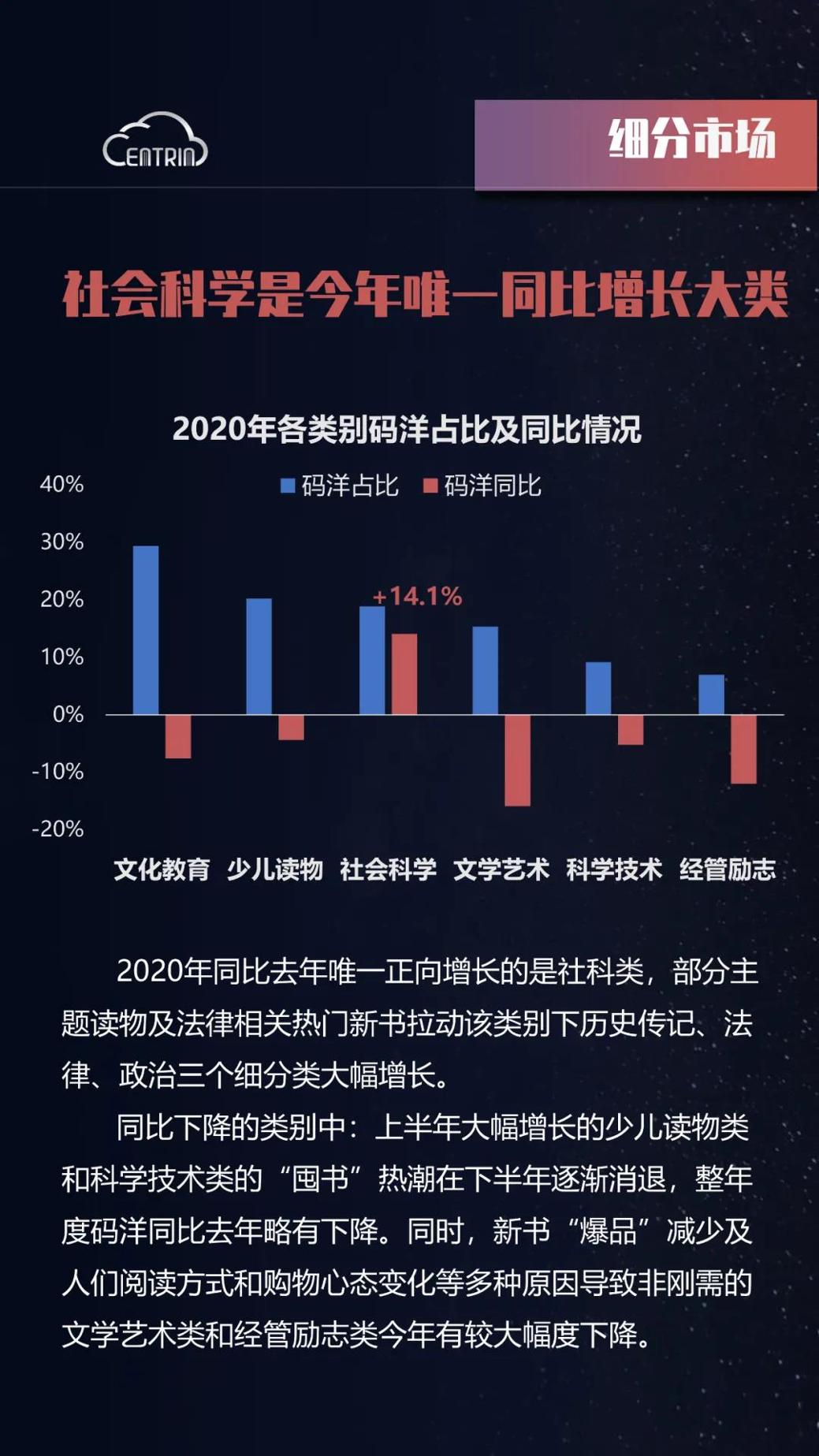 报告显示,2020年同比2019年唯一正向增长的是社科类,部分主题读物及法律相关热门新书拉动该类别下历史传记、法律、政治三个细分类大幅增长。在同比下降的类别中,上半年大幅增长的少儿读物类和科学技术类的“囤书”热潮在下半年逐渐消退,整年度码洋同比去年略有下降。同时,新书“爆品”减少及人们阅读方式和购物心态变化等多种原因导致非刚需的文学艺术类和经管励志类今年有较大幅度下降。
