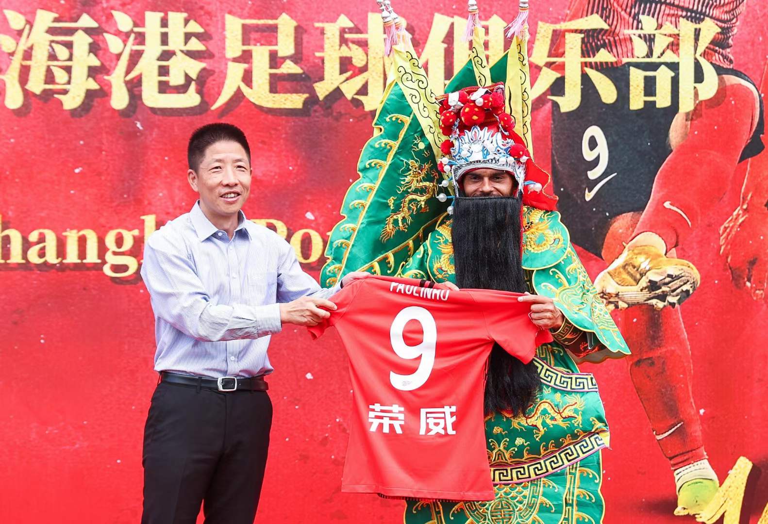 虽然保利尼奥已经身穿海港战袍进行了5场比赛,但俱乐部保留了球衣颁发环节,海港俱乐部董事长张敏亲自将9号球衣交到保利尼奥的手中。