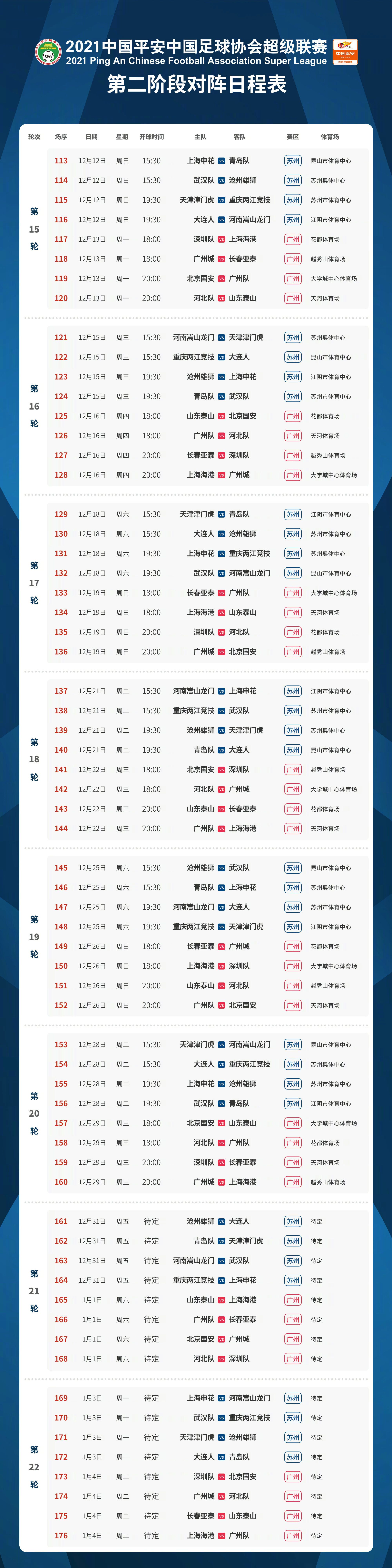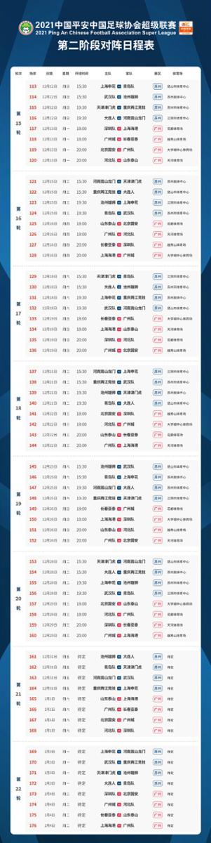 由于国足12强赛与国家防疫政策的影响,原本30轮的联赛本赛季缩水至22轮,在8月中旬结束第一阶段的所有比赛后,中超进入了长达近4个月的休赛期。最终,按照中国足协、中足联筹备组及其它各有关方面沟通的结果,本赛季中超联赛第2阶段保级组、争冠组赛事分别将于12月12日、13日在苏州、广州赛区拉开序幕,并分别于明年1月3日、4日结束。