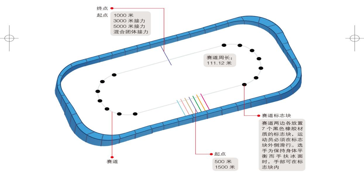 赛道前端有光电感应系统,后端有电子计速系统,测定运动员在计速区内的最高速度,减速区是一个逐渐向上的斜坡,便于运动员减速与停上。