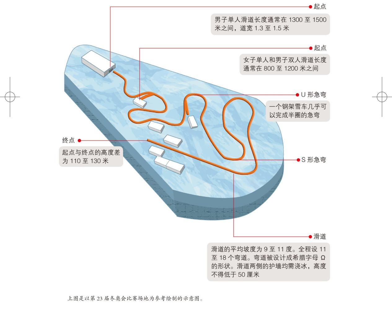 与雪车项目一样,滑道长1,200米~1,300米,平均倾斜度为8%~15%,曲线半径须至少在20米以上。滑行转弯时,压力接近于地球重力的4倍,平均时速达到100公里。在曲线、直线、马蹄形(Ω)滑道上保持加速度,滑行绕过14~22个弯道是该项赛事的重点。