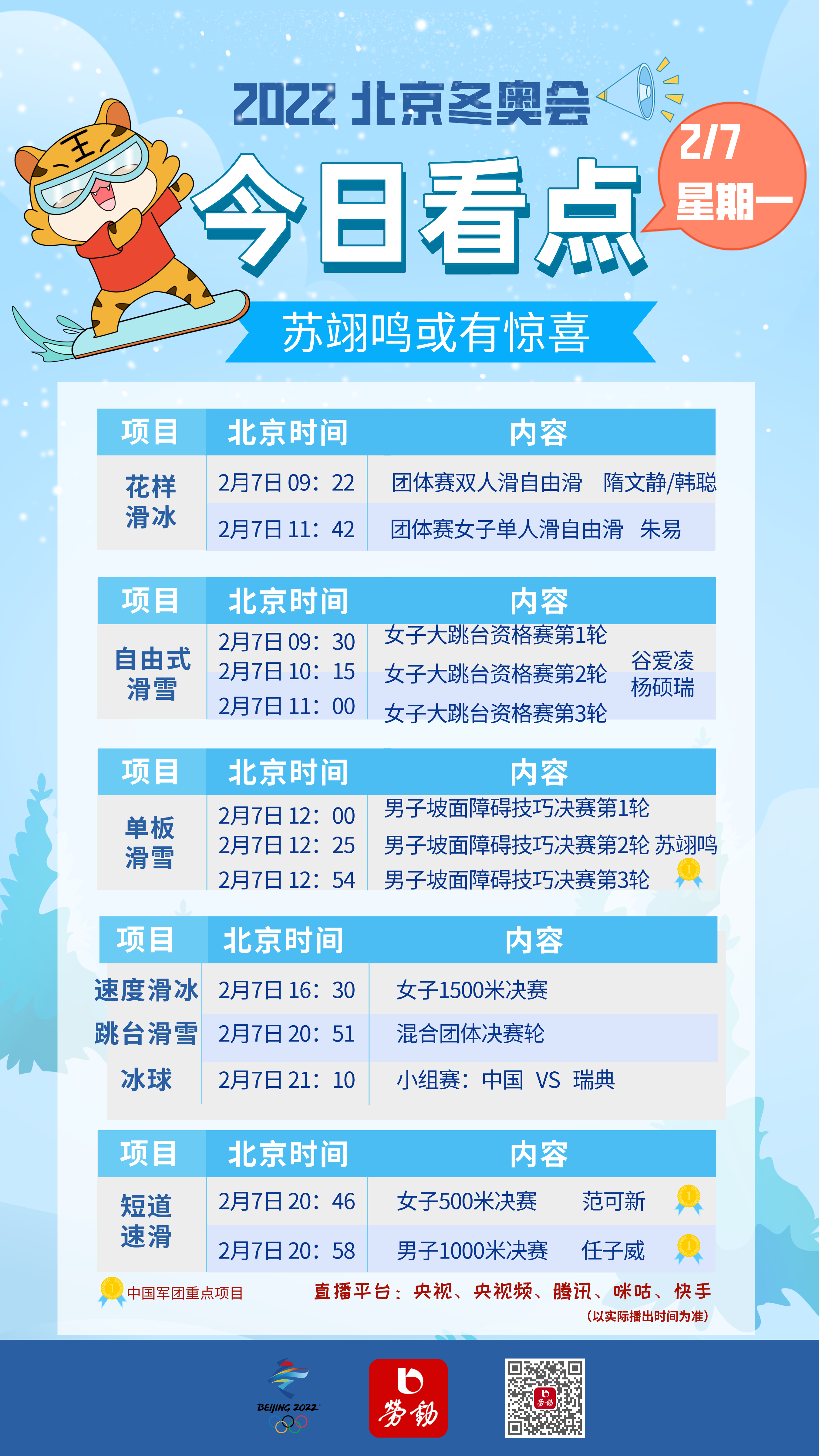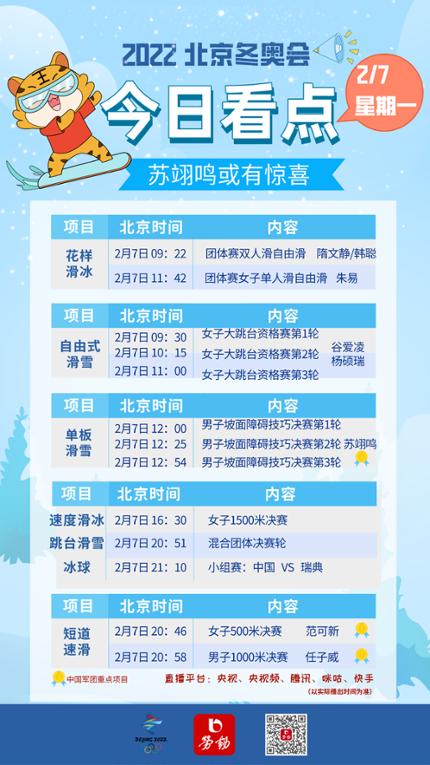 2月7日,北京冬奥会将在7个项目产生8枚金牌,分别是:花样滑冰1金,单板滑雪1金,高山滑雪1金,速度滑冰1金,冬季两项1金,短道速滑2金,跳台滑雪1金。