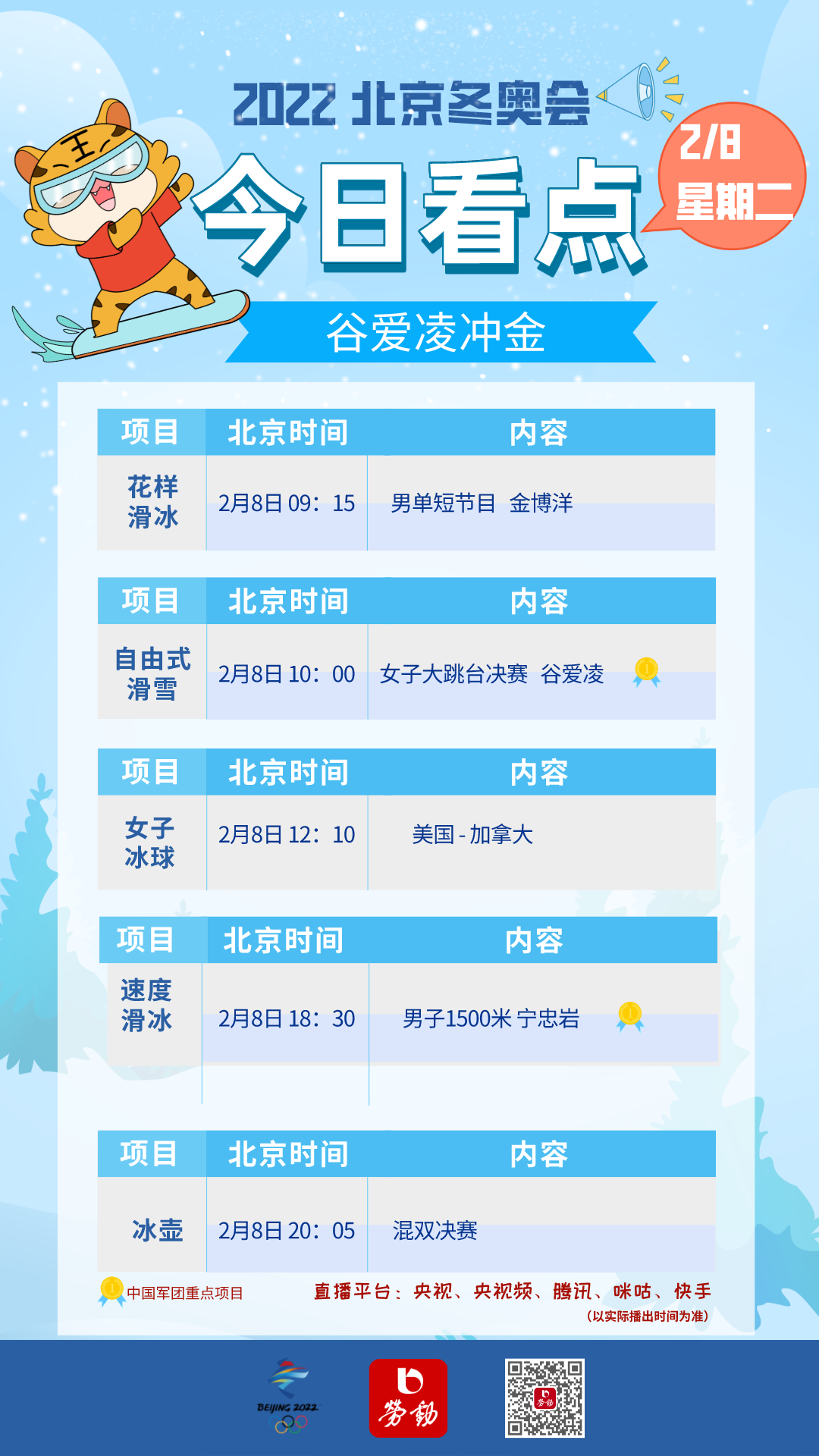 2月8日,北京冬奥会进入第四个金牌日,全天将产生10枚金牌。中国军团里,最引人关注的依然是谷爱凌,尽管自由式滑雪女子大跳台不是她的强项,但也不排除逆袭夺金的可能。