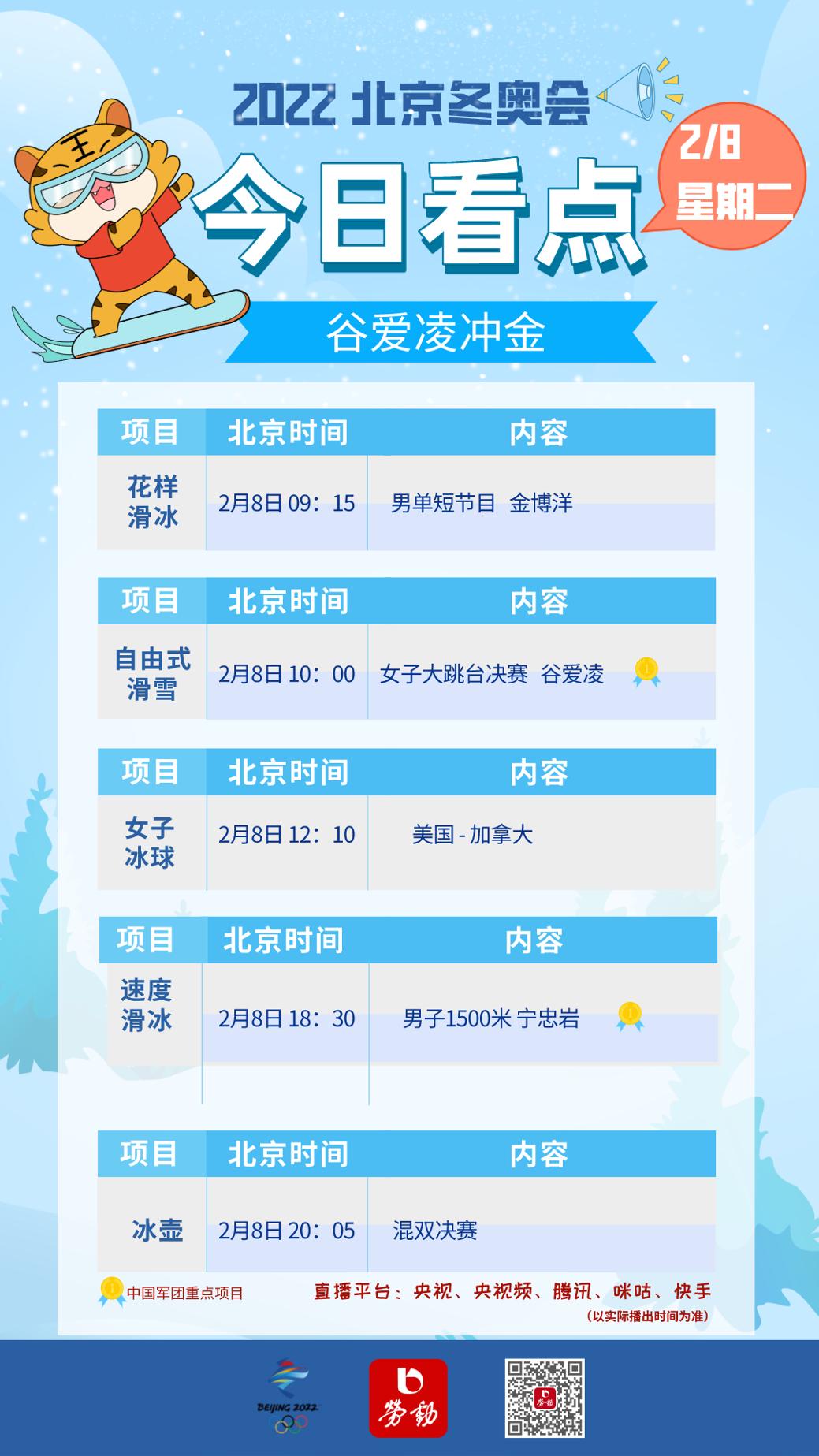 此外,8日早上的花样滑冰男单短节目,日本名将羽生结弦将向着自己的冬奥三连冠发起冲击,羽生结弦和陈巍也将再次展开巅峰对决,中国选手金博洋同样会登场亮相。还有午间开赛的女冰小组赛,目前世界排名前两名的球队,美国和加拿大将上演本届冬奥会的第一次交锋,这场比赛也堪称决赛的预演,同样值得关注。