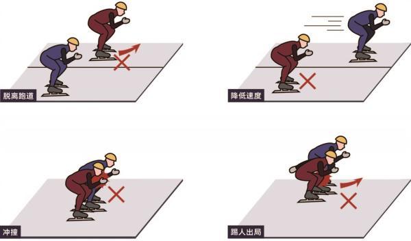 根据国际滑联的规则细节,有几种情况会被判罚犯规,一是脱轨,二是阻挡,三是协助犯规,四是蹬踢冰刀。其中,阻挡是出现频率最高的犯规。规则规定,运动员的以下行为会被判为阻挡犯规:阻挡、拦截、变线或用身体的任何部位推另一名滑行者;横向穿过另一名滑行者的路线,从而引起碰撞和干扰。