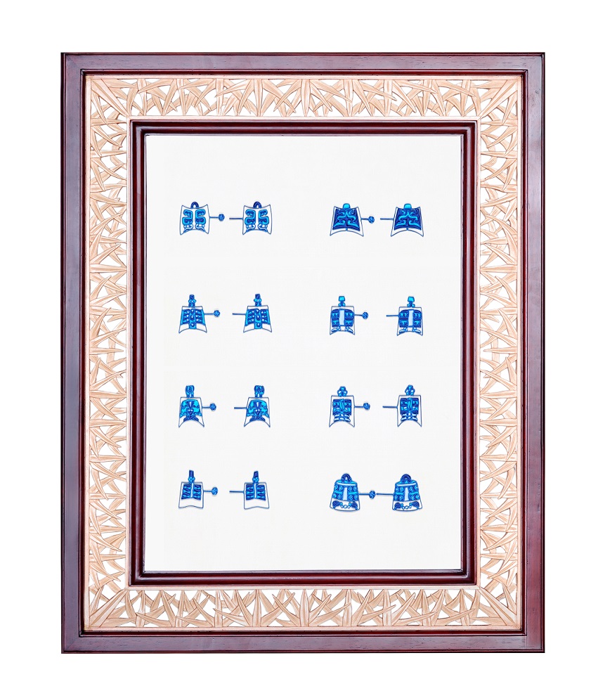 除了严苛的制作工序外,在这些作品中盘扣的种类亦十分丰富,从普通一字扣到栩栩如生的蝴蝶扣、象征吉祥如意的寿形扣等,应有尽有,样式大多来源于民间美好的事物和富有吉祥寓意的图腾。