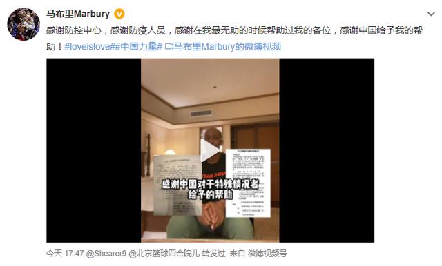 7月19日,CBA北京北控主教练、前NBA球星马布里通过社交媒体录制了一段视频,他通过自己的讲述,介绍了自己在隔离期间收到亲哥哥离世消息后,得到上海防疫人员帮忙,从而提前结束隔离,及时返回美国的消息,“感谢防控中心,感谢防疫人员,感谢在我最无助的时候帮助过我的各位,感谢中国给予我的帮助!”