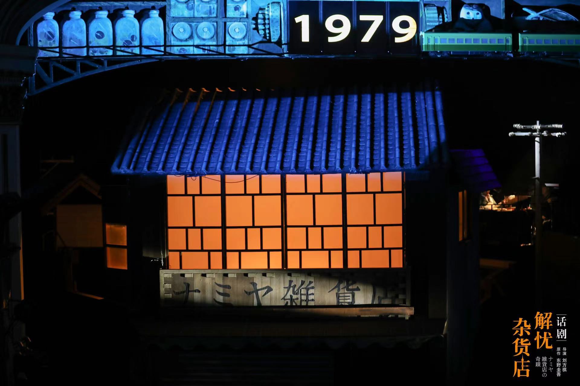 在舞美上,演出借助全新的舞台装置与影像手段,譬如运用转台解决空间转换,用齿轮投影、舞台上方的LED屏以及景深处的“月亮”等来解决时间转换。浪矢杂货店更是一个时空隧道的入口,连接着当下与三十年前的神奇场所。同时多个小道具被用来推进叙事,各种玩具不知什么时候也会“复活”起来,使观众获得出其不意之惊喜。
