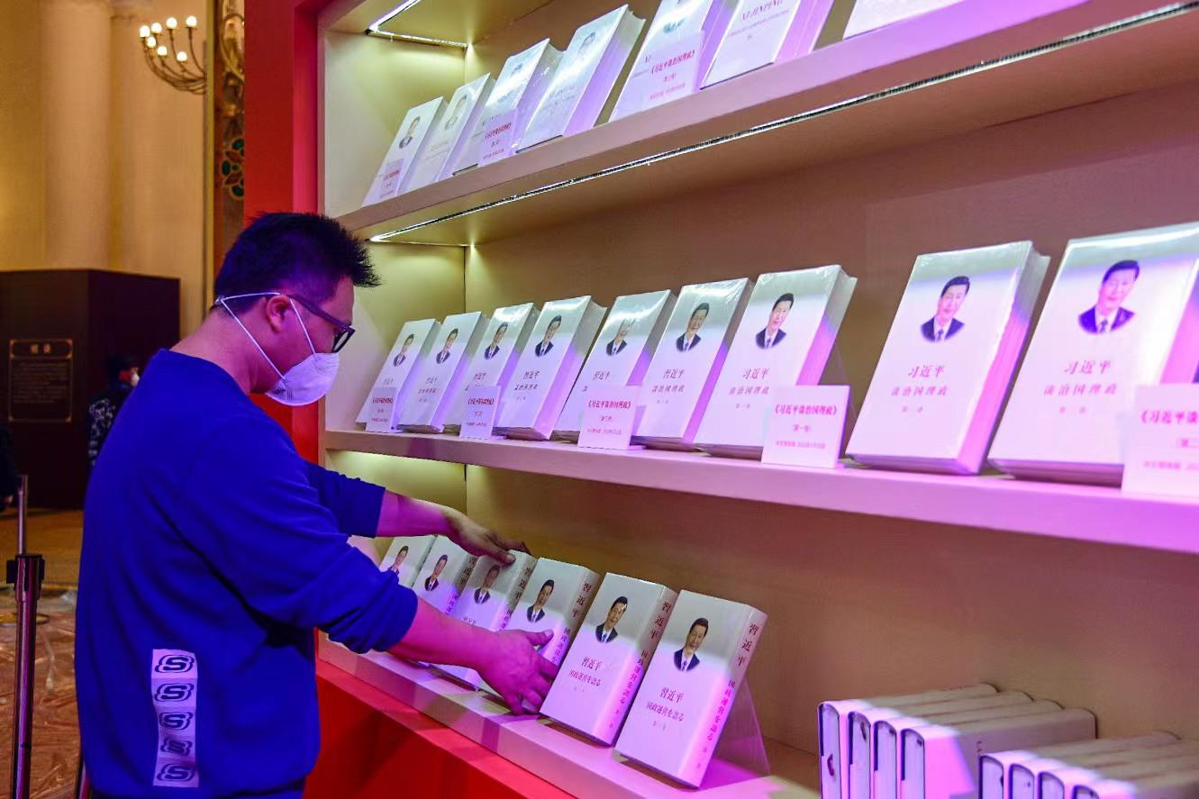今年的主题展示展区仍位于序厅中间。4组主题书架集中展陈《习近平谈治国理政》(1-4卷)、习近平总书记系列著作及论述、党的二十大文件系列及重点图书、主题出版成果和国家级获奖图书,集中呈现“阅读新时代”的出版发行成果,彰显主流价值,营造书香氛围。