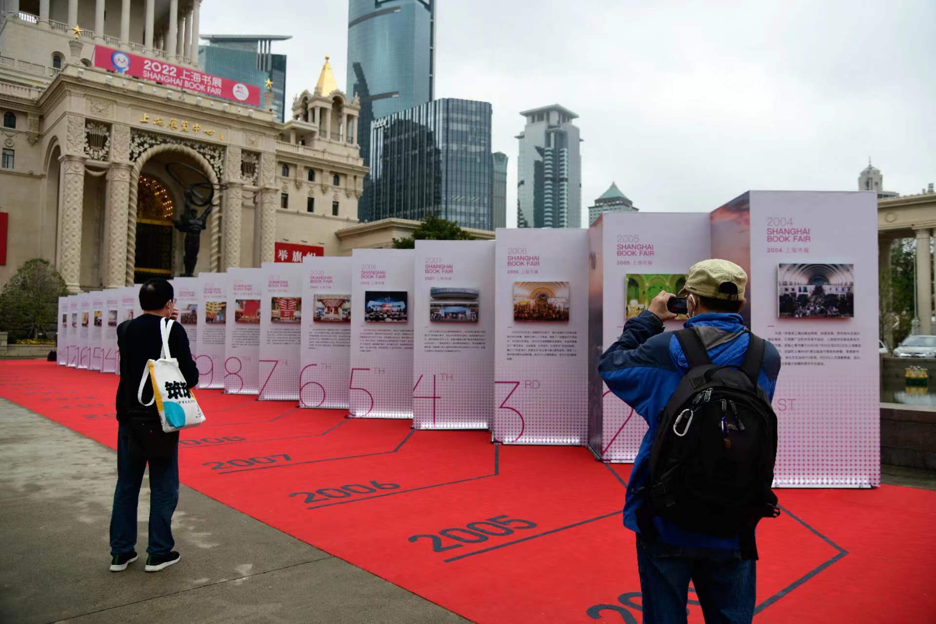在上海展览中心延安中路2号口入场处,醒目的2022上海书展logo和鲜红色的地毯吸引了不少读者在此打卡拍照。位于喷水池广场一侧的书展历程展示区,展板回顾了过去十七届书展和“上海书展·阅读的力量”2021系列活动,记录下每年的重要时刻。踏上标记着2004年至2022年每一年份的红毯,读者在步入展厅的同时,也能了解上海书展的发展历程,更增添了一份与书展共同前进的仪式感。