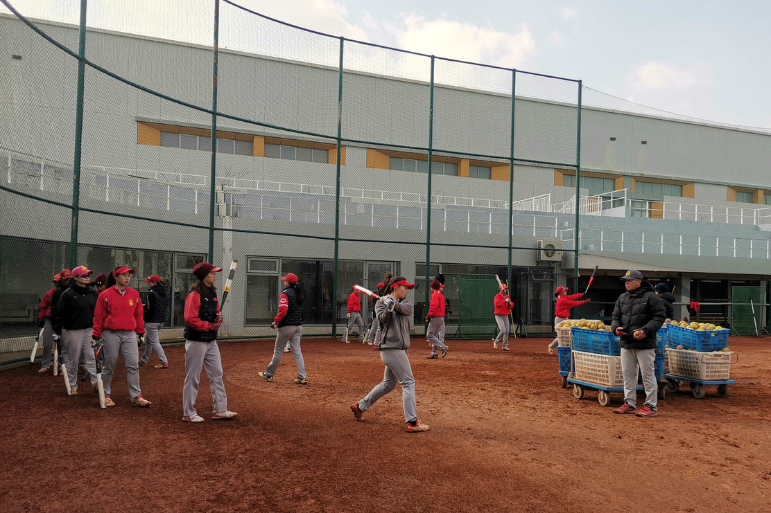 (女子垒球队在寒风中坚持训练)