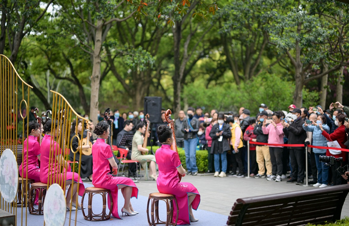 沉浸式评弹演出也是此次游园会的亮点之一,评弹艺术家们以唱、说、弹的形式,生动演绎了经典评弹曲目,将牡丹文化与传统音乐完美结合,让游客在赏花的同时感受到传统戏曲的魅力。跨界的歌舞表演和旗袍展示也让游客们穿越时空,感受到了中华文化的艺术性和多样性。