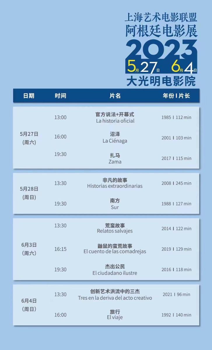 由上海市电影局指导,上海市电影发行放映行业协会下设组织上海艺术电影联盟主办的阿根廷电影展,日前在大光明电影院拉开帷幕。即日起至6月4日,影展将为申城观众带来10部经典与新片相结合的阿根廷电影佳作,带来大家在光影中领略阿根廷的风情。