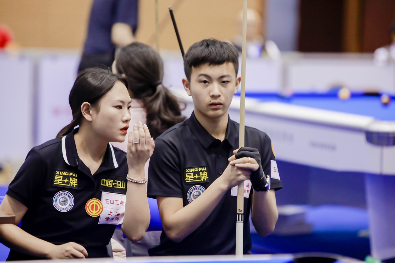 混双选手在比赛中商量战术。浦东台球协会供图