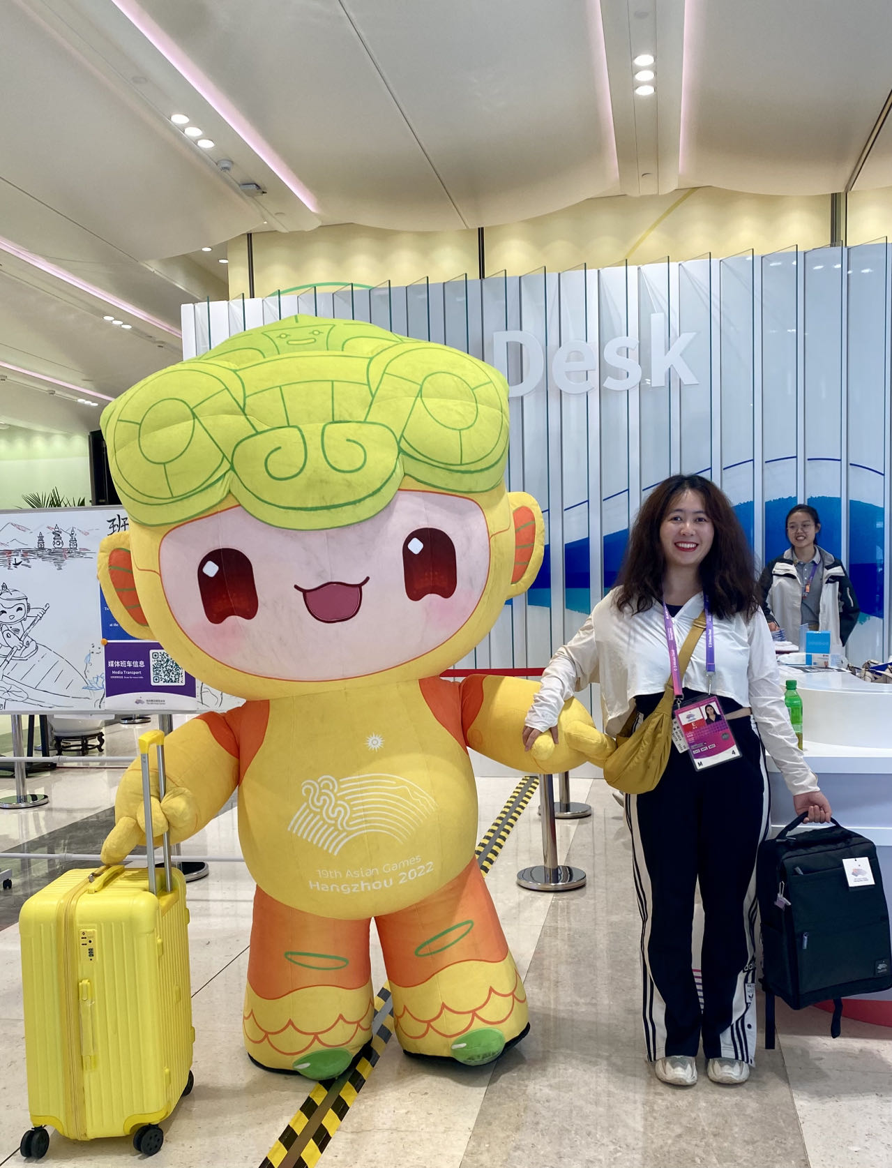 进入亚运村后,每走一步都像是踏着当年那场焰火。更令我惊喜的是,我亚运之旅的开始,竟还有意外收获。注意到村里的一条干路名为“琮琮路”时,心中便暗觉可爱。在主媒体中心报到时,转身竟又看到一个比我还要高上许多的琮琮人偶笑意盈盈地走过来,还憨态可掬地冲我挥手。一旁的工作人员笑着招呼我,“你们是同一天报到,给你们合张影吧!”于是,我与拖着行李箱的琮琮,与这次杭州亚运会,有了一张手拉手的合照。