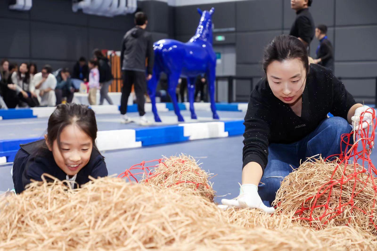 小朋友和家长一起装草料,学习马房管理。主办方供图