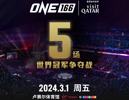 国际知名体育IP–ONE冠军赛正式宣布,将在2024年3月1日正式登陆卡塔尔,于卡塔尔卢赛尔体育馆举办ONE 166。此次亮相卡塔尔的首秀,将会为观众带来5场世界冠军争夺战,包括综合格斗、泰拳、踢拳和降服缠斗。