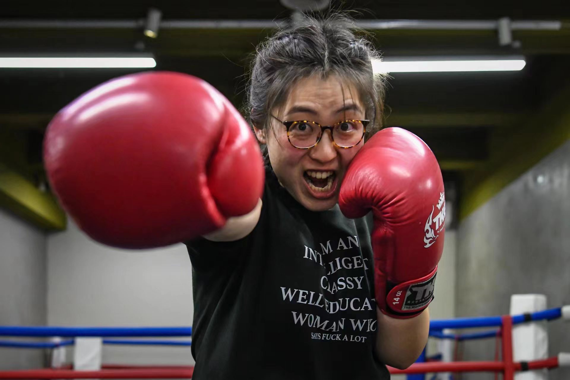 训练的间隙,看到教练搬过来一打可乐,雅菲顺手打开,咕咚咕咚喝了几口,“我们也不在乎减不减肥,可乐还是照常喝,不去想那么多,反正胖了就去练,开心是最重要的。”但她告诉记者,拳击是一项逻辑性很强的运动,在进攻的同时还要学会预判和思考,如何才能躲掉对手打过来的重拳,“我们这里很多拳友都是毕业于名校的高材生,打拳的人都很聪明,因为你的脑子一直在转,我觉得打拳不太容易得老年痴呆症。”