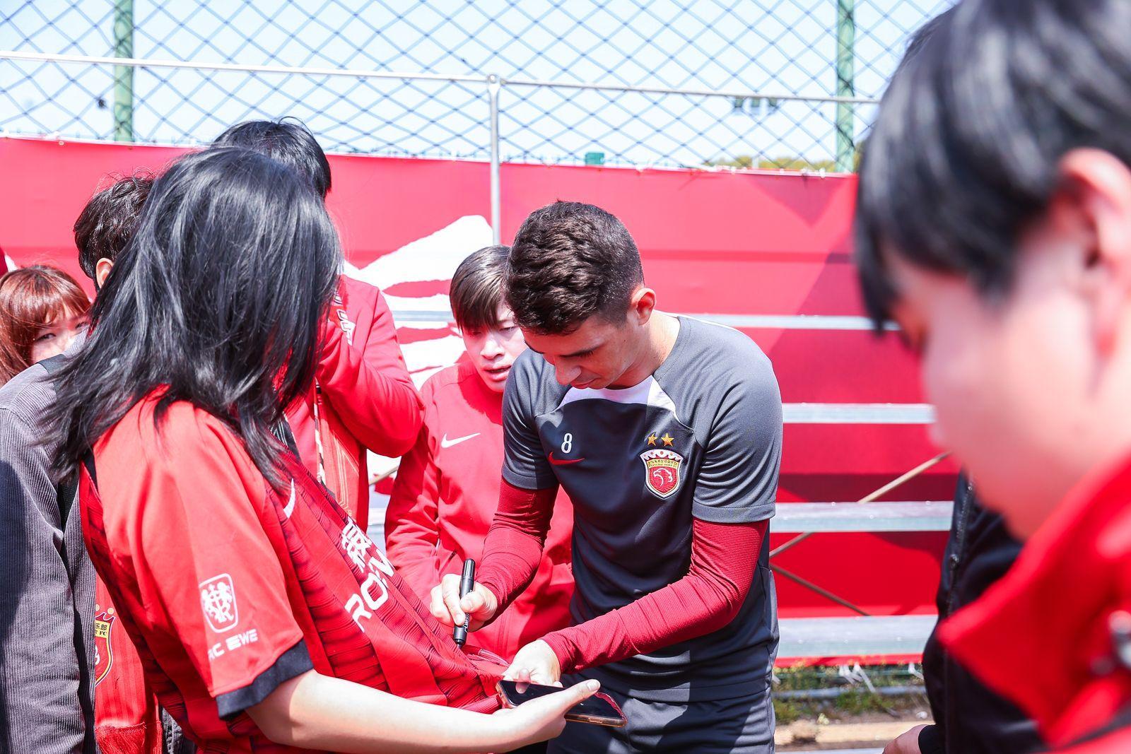 在球队训练过程中,球员们的精彩防守和进攻都会赢得围观球迷们毫不吝啬的加油和喝彩,训练场充满了欢声笑语。刚刚伤愈复出,正在进行恢复训练的队长奥斯卡,特意在跑步过程中前往靠近球迷的区域,和球迷们挨个击掌,赢得了大家的掌声和欢呼。
