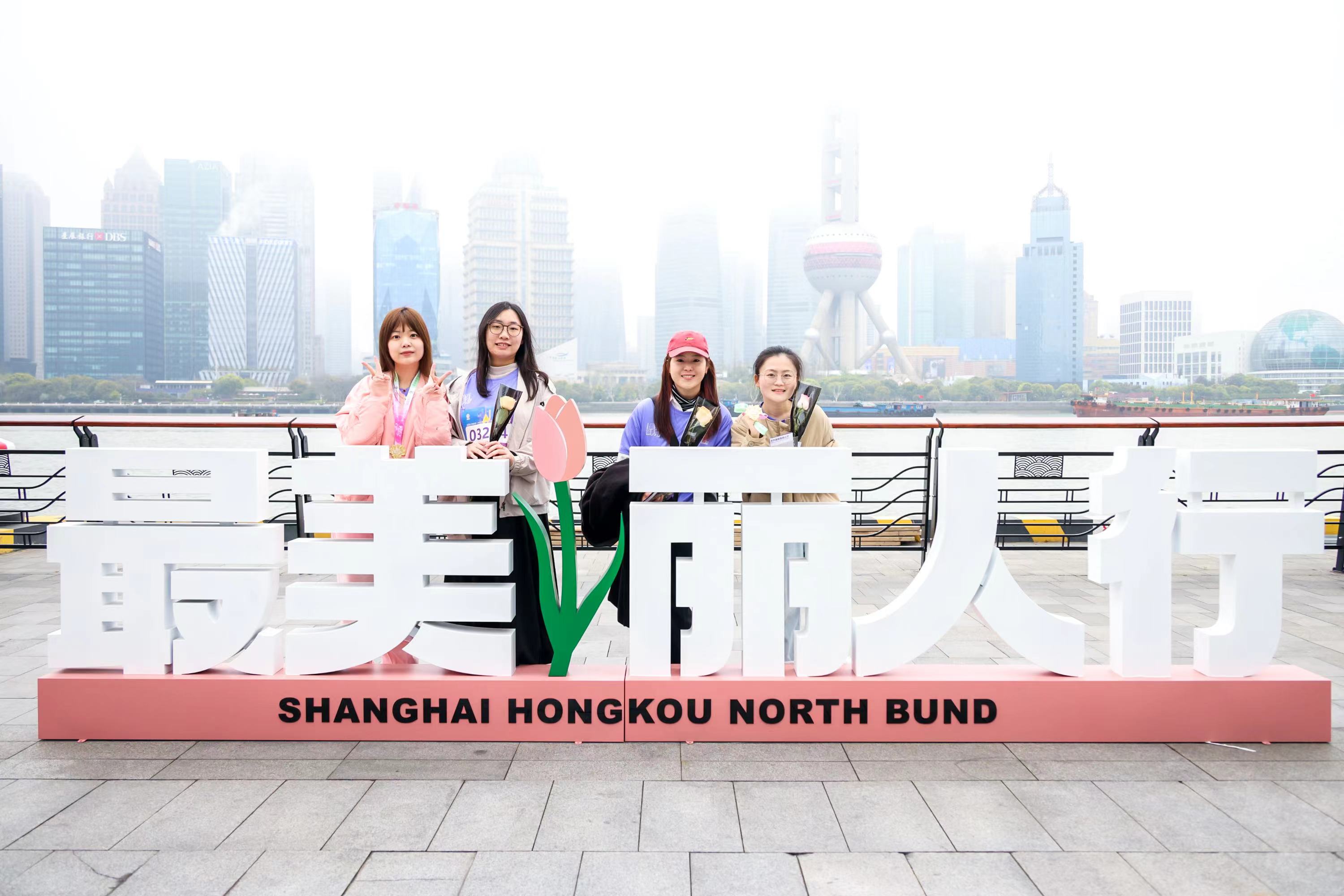 同时,粉紫色系的赛事服装映衬出女子的娇艳面庞,花型赛事奖牌蕴含樱花、玉兰花、玫瑰的元素意喻不同女性都有自己独具特色的美,每个细节都在打造女性漫步北外滩的场景,实现女性之美与虹口北外滩之美的双向赋能。