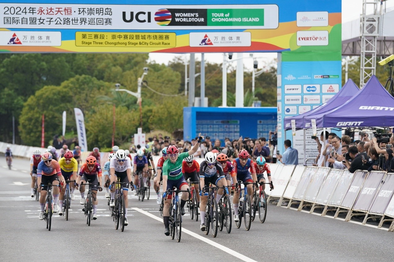 “观环岛女子世巡赛,赏崇明生态之美”,2024年永达天恒·环崇明岛国际自盟女子公路世界巡回赛17日开始第三赛段——崇中赛段暨城市绕圈赛角逐,这也是本次赛事的收官赛段。