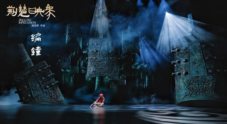 舞台剧《荆楚映象》在舞美布景、音乐编排等方面也给观众带来了视听双重盛宴。走进上海大剧院,舞台上矗立着的一扇青铜巨墙就让人眼前一亮,细看墙上满是青铜饕餮纹样的雕塑。杨丽萍解释道,曾侯乙编钟作为楚文化极具代表性的器物,是湖北省博物馆的镇馆之宝,在《荆楚映象》的舞台上,主创团队在传统编钟的基础上注入了现代化的动感元素。演出中,观众听到的编钟之声就来自曾侯乙编钟的原件,那是音乐总监谭盾1997年创作交响乐《天·地·人》时在湖北省博物馆录制的,2400多年前的古老声音穿越时空而来,实现了一场遥远的对话。