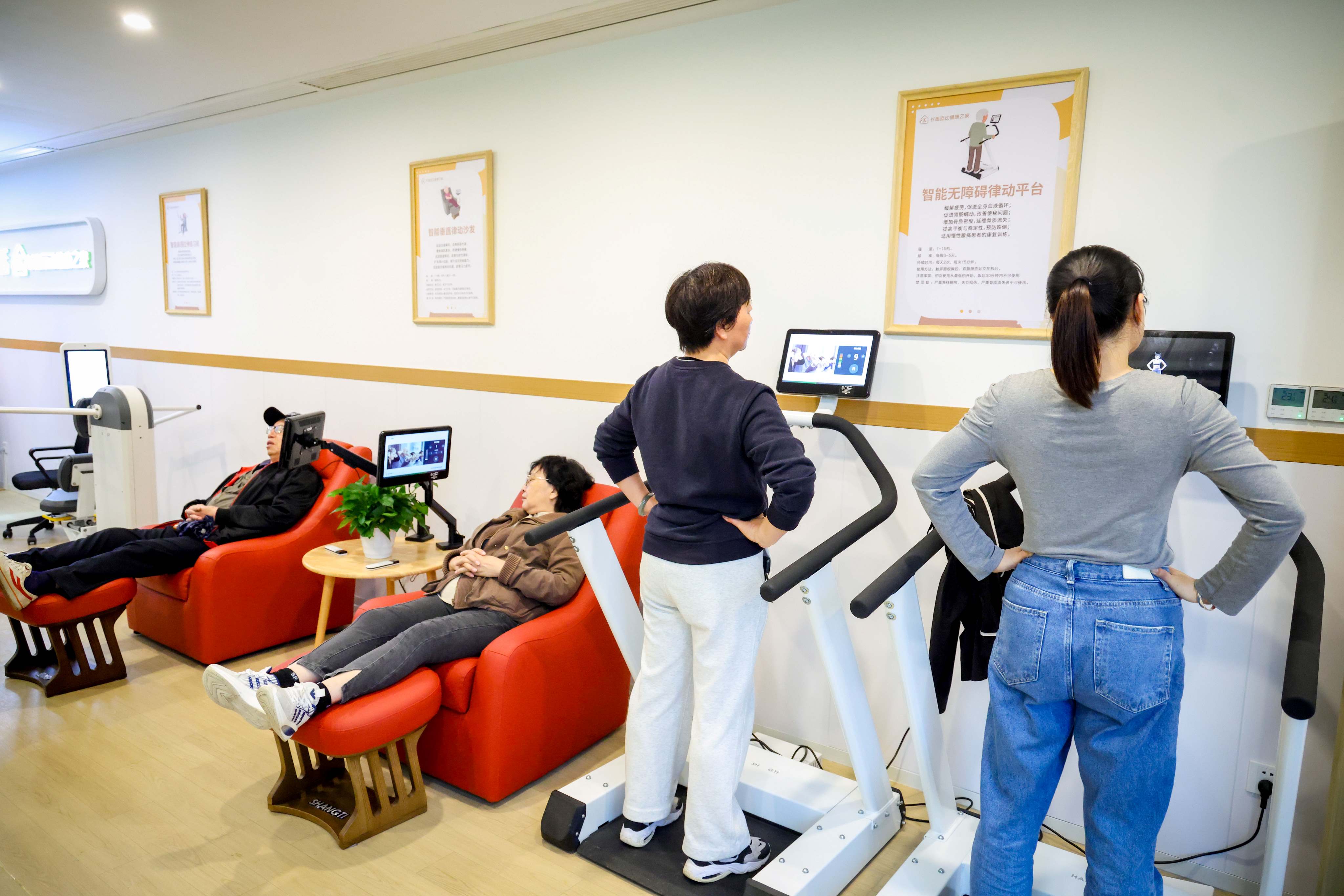 头图为老年人在新建成的定海路街道长者运动健康之家锻炼。尚体健康图
