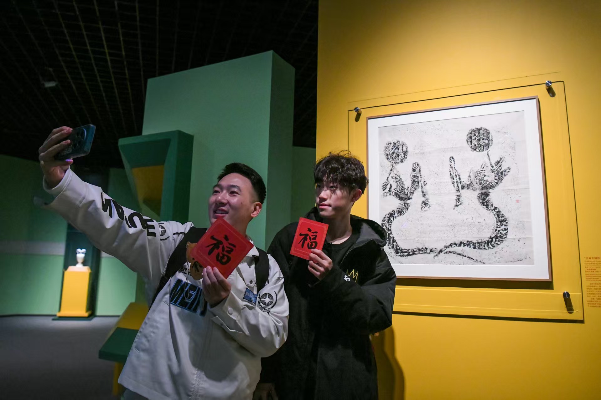 头图为市民打卡上海博物馆“灵影仙踪:上海博物馆蛇年迎春展”,与“伏羲与女娲捧日月”画像石拓片自拍合影。