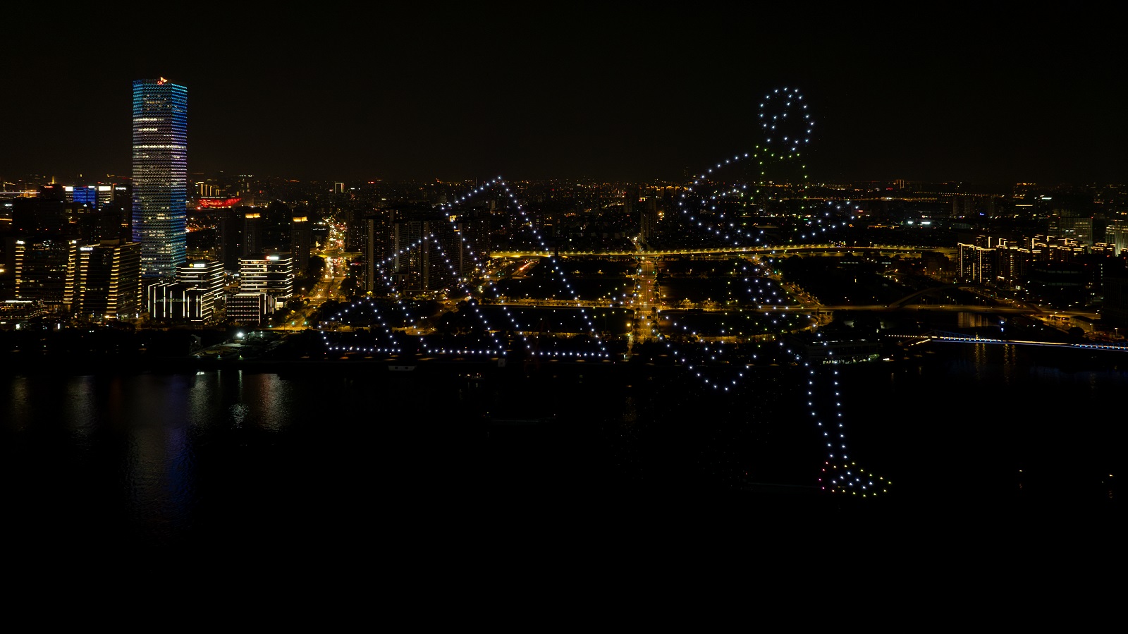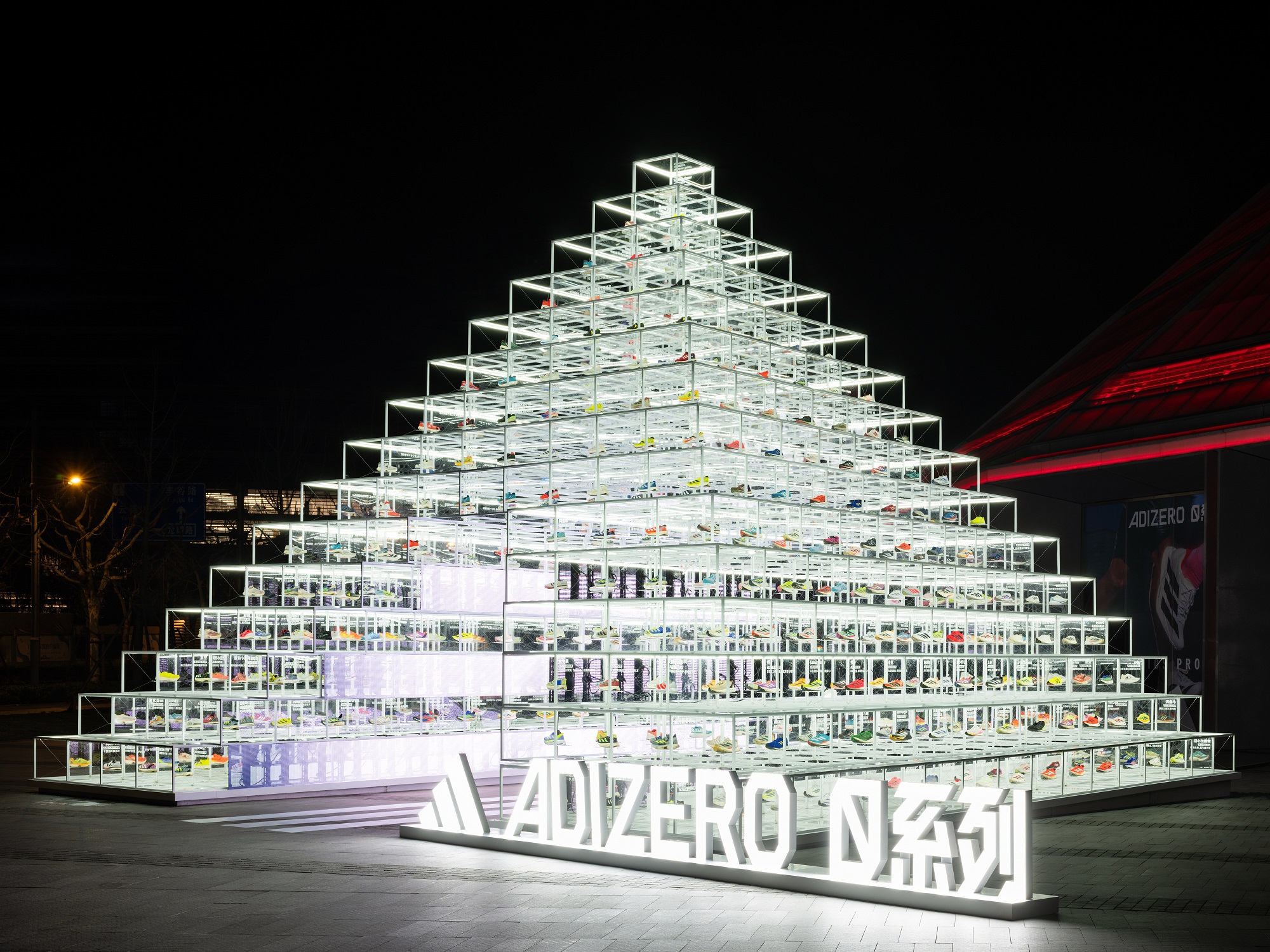 以创新运动科技满足多元中国跑者需求的同时,发布会当晚,阿迪达斯还别出心裁,以一场大型无人机表演点亮滨江夜空,并打造了一座满是故事的巨型“赛博鞋塔”,致敬中国跑者,助燃上海的跑步热潮。