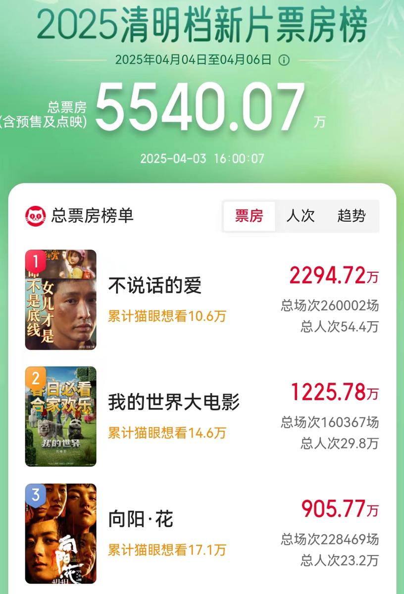 据猫眼专业版数据显示,截至4月3日16时,2025年清明档电影(含重映)预售总票房已经突破5540万元。其中《不说话的爱》以2294万元的成绩断层领跑,其次是好莱坞引进大片《我的世界大电影》和冯小刚导演新作《向阳·花》,重映的《热烈》也有440万预售票房,超过日本动画《机动战士高达:跨时之战》和国产新片《猎狐·行动》《阳光照耀青春里》等。