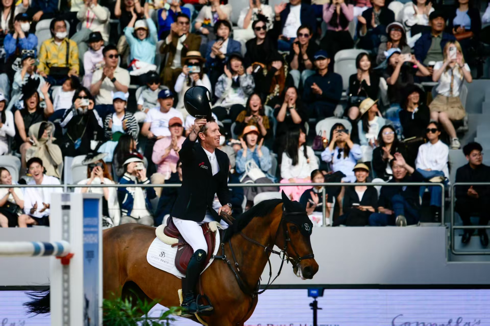 压轴上演的最高组别1.60米比赛更是悬念迭出、精彩纷呈,最后一个登场的英国名将斯科特·布拉什发挥出色,以零罚分、43.94秒的成绩夺得,赢得满场欢呼。布拉什在赛后表示:“排在最后一个出场不容易,需要等很久。但我的马发挥非常棒,速度很快。”