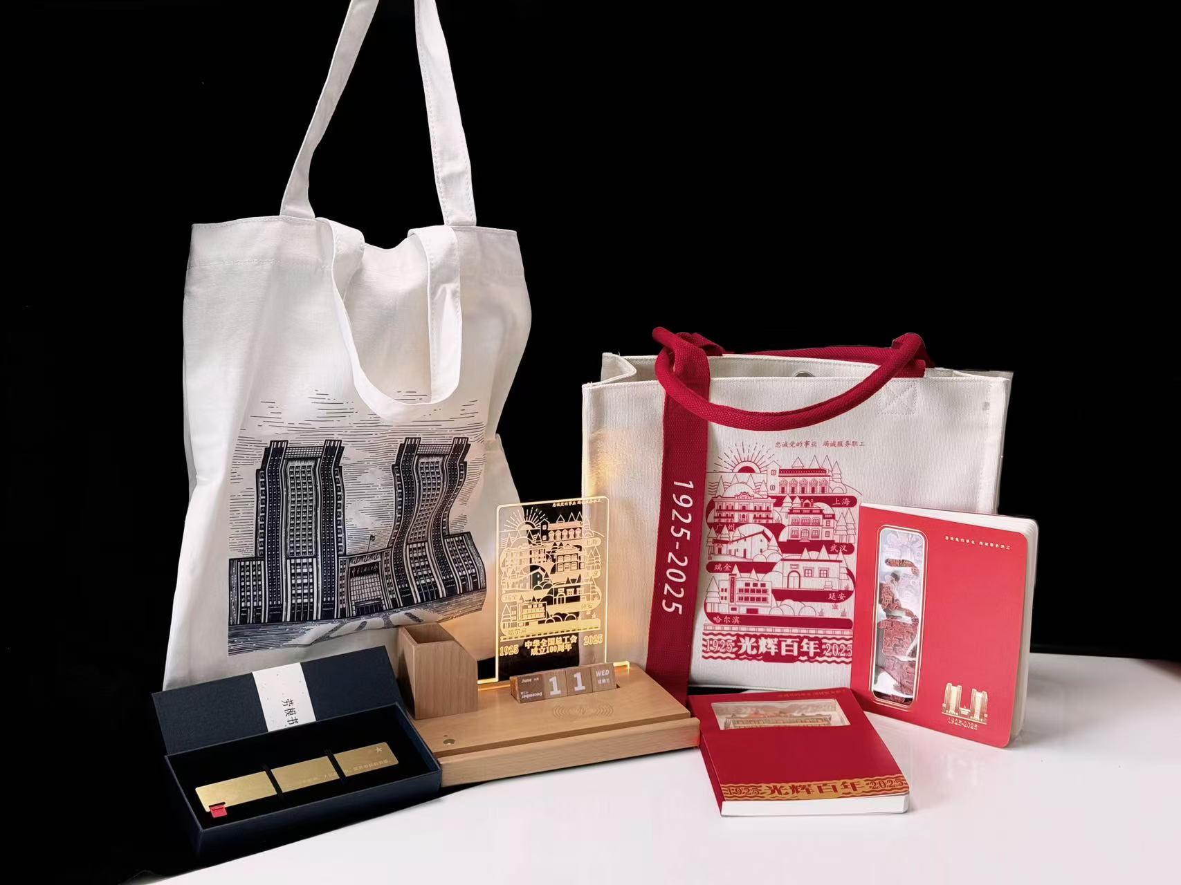 与许多“为纪念而纪念”的产品不同,“光辉百年”在设计上保持庄重风格的同时,注入了年轻化与日常化的巧思:帆布包采用红白配色与织带设计,呈现出仪式感与时尚感的平衡;透明雕刻台历灯将红色建筑融于立体光影之间,既是办公装饰,也是精神坐标;而镂空工艺笔记本、典雅书签等产品则在细节中传递文化温度。