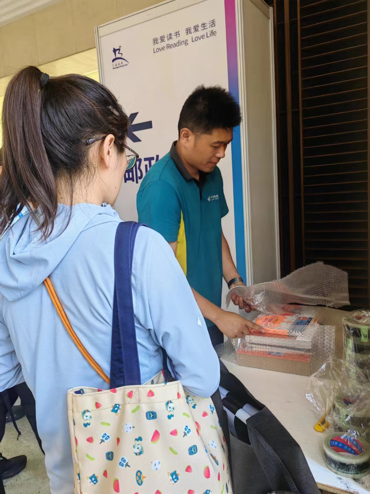 打包员王师傅经验丰富,只见他一边引导读者扫码下单,一边看了眼图书的尺寸规格,不到两秒钟就用剪刀裁出了合适的包装膜,两个手腕左右旋转,透明胶带被流畅有序地缠绕在四周,顺势放入纸箱,再贴上上海书展VIP的标识,短短3分钟烦恼便迎刃而解。