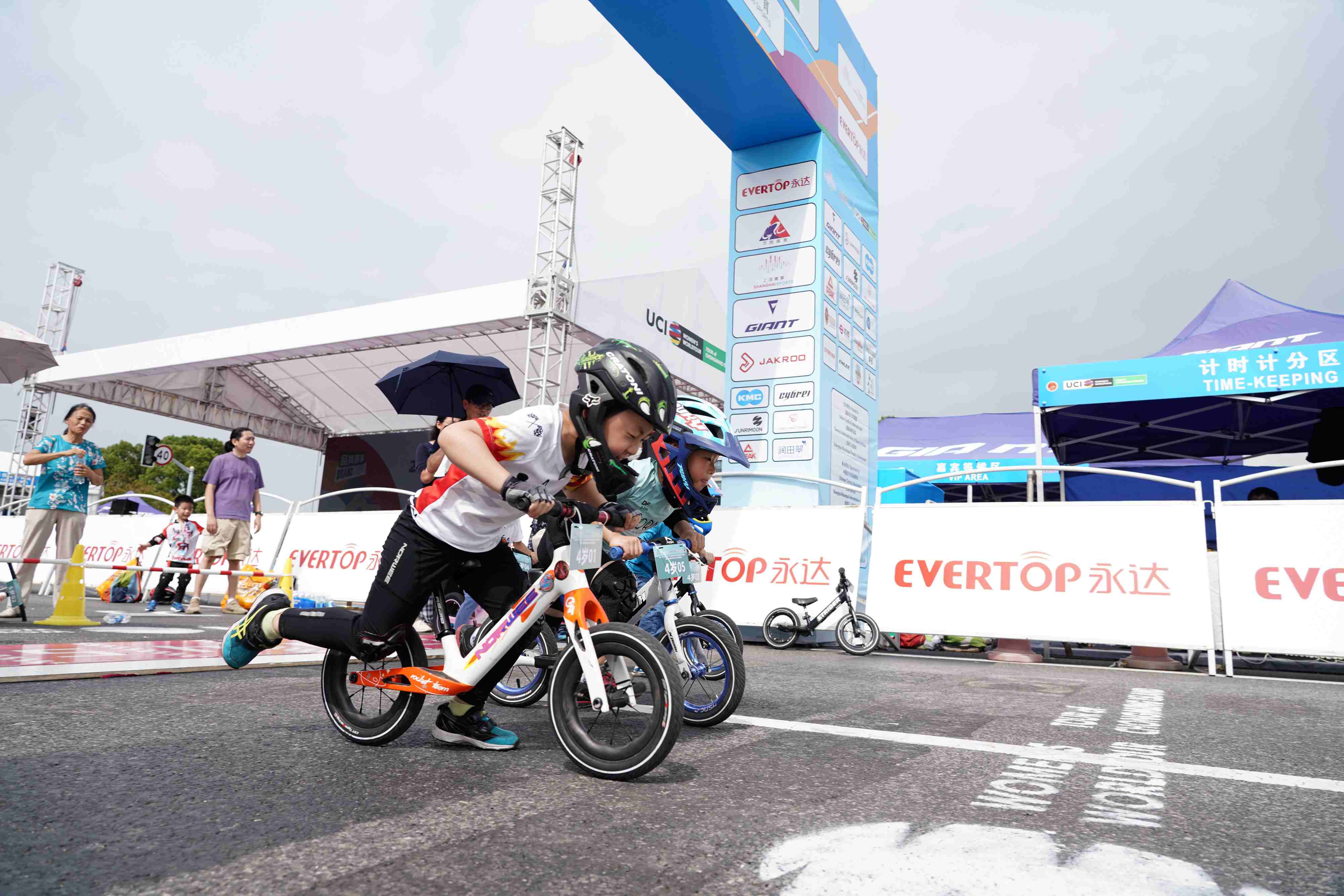 值得一提的是,就在全球顶尖选手们在崇东赛道上破风疾驰时,赛段终点、崇明大道新城公园内,上海市少儿体育联赛平衡车超级联赛(崇明站)暨小小滑步车赛SKIDS环崇明赛站比赛的举行,也吸引了众多关注的目光。当从2岁到5岁不等的孩子们,在起点线上一字排开,大声喊着“我要争第一”为自己鼓劲时,现场观众不禁为自行车运动精神传承的这感人一幕,而纷纷呐喊助威。