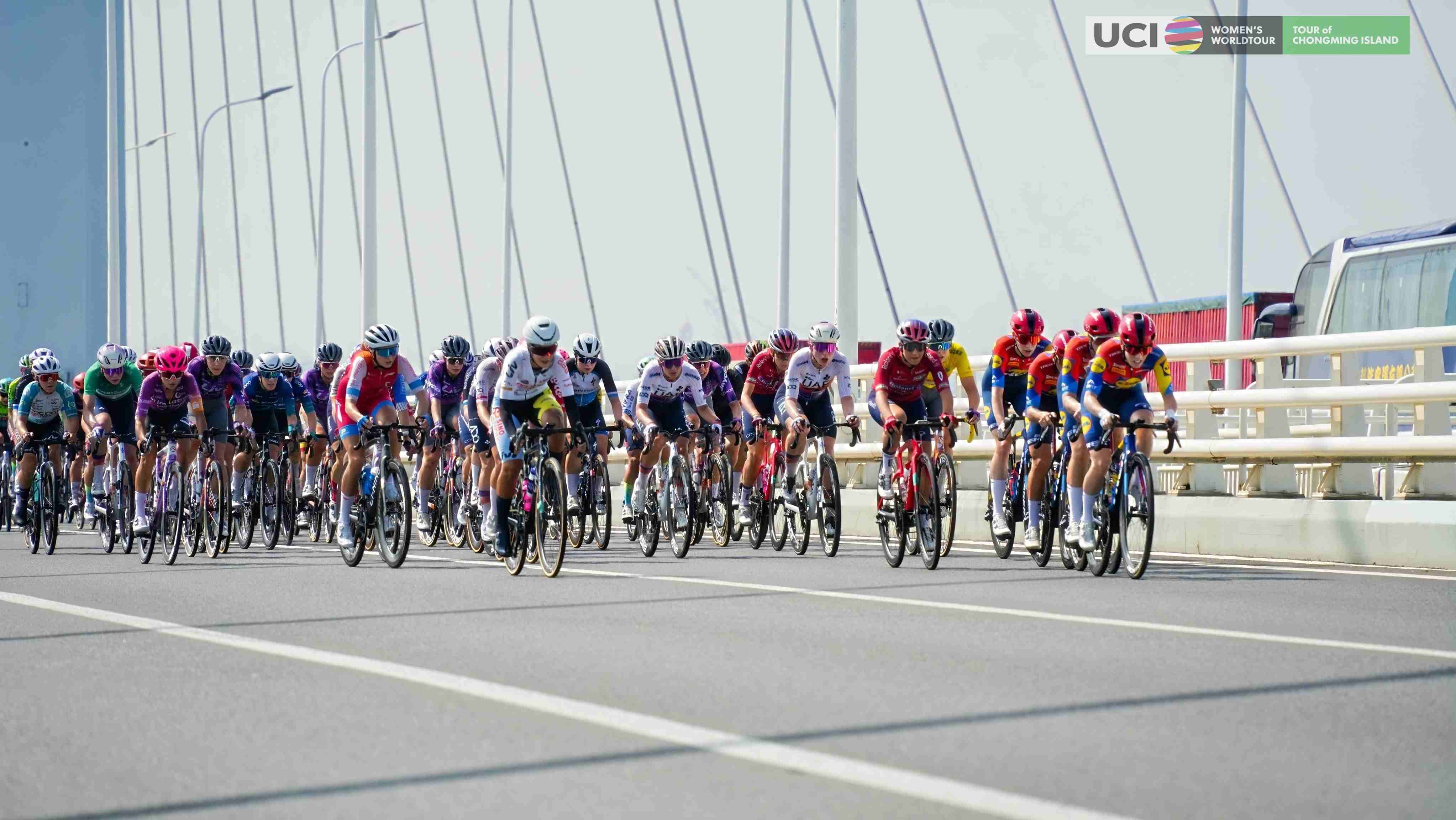 作为本届比赛最长的一天,崇东赛段穿越了长兴岛郊野公园、上海长江大桥、东滩湿地公园等标志性景观。上午11点10分,车手们从长兴岛郊野公园出发后,很快来到上海长江大桥。所有人形成大集团前行,桥上的顶风和上坡赛道让车队速度有所下降,这也给了爬坡能力强的车手机会。