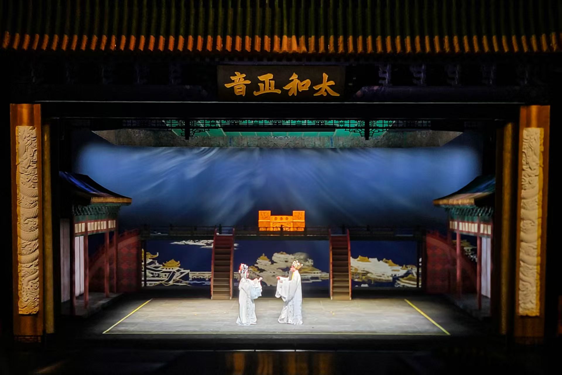 在音乐呈现上,乐队进行了扩编,增强了音乐的层次感与磅礴气势,既严格遵循昆曲曲牌格律,又在《江州送酒》《中秋奏凯》无原始曲谱的情况下,唱腔作曲根据词意和四声腔格规律进行谱曲式作曲,并对《长生殿·重圆》经典唱段予以守正创新。舞美设计灵感汲取故宫畅音阁神韵,融合传统殿阁元素与现代视觉技术,营造出既古典庄重又富有当代审美意趣的舞台空间。