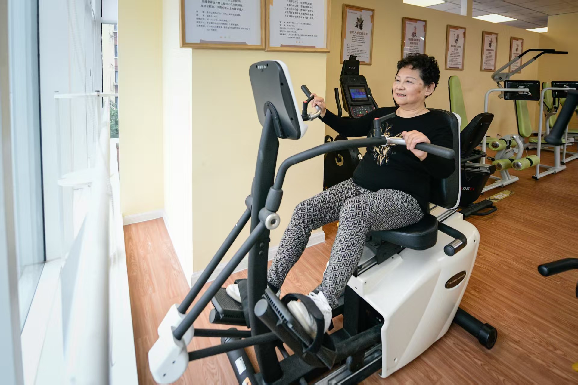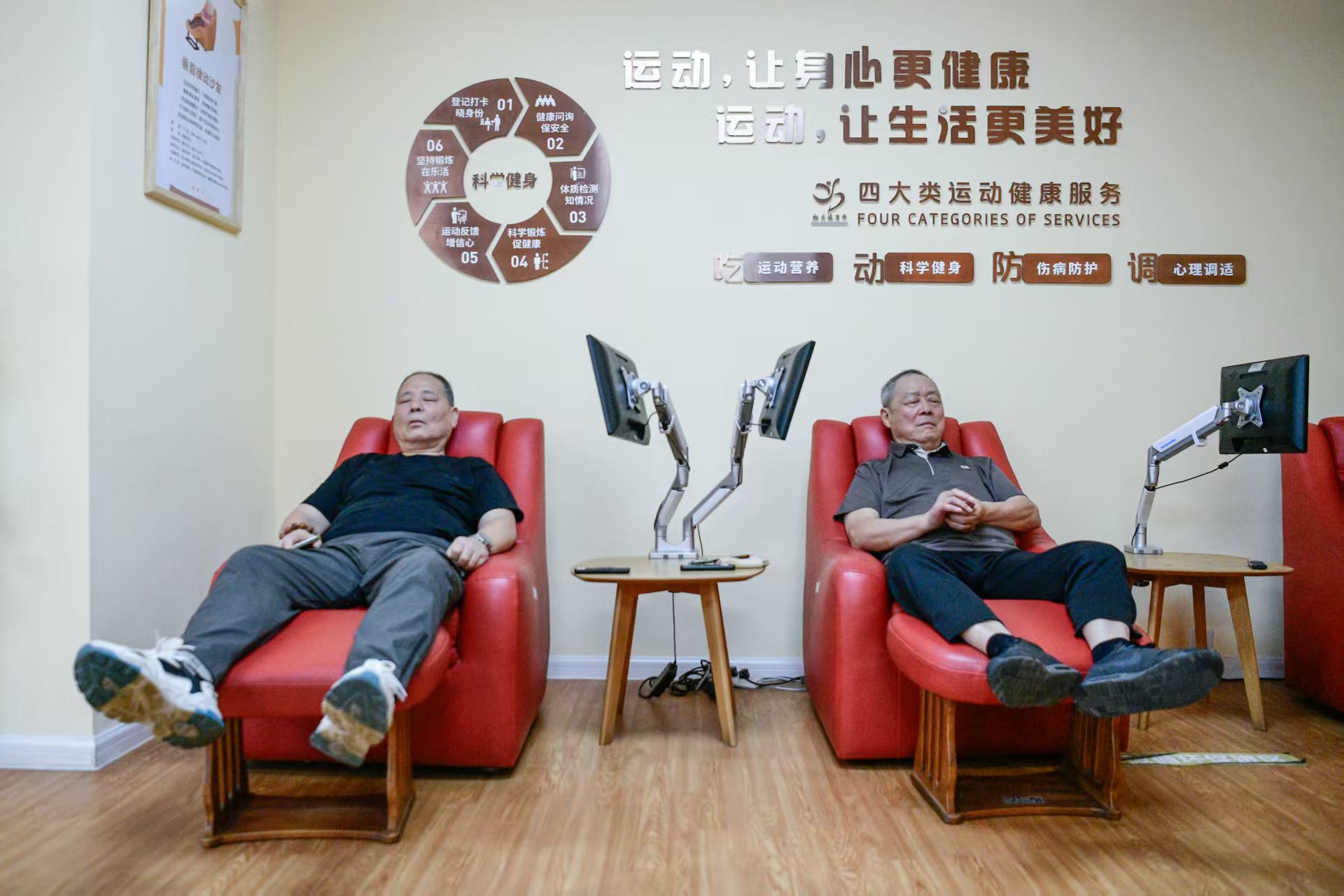 裘备其老人70多岁,患有糖尿病,过去久坐导致腿软、膝盖疼、胸闷,“蹲都蹲不下去”。加入健身房后,他每天打半小时乒乓球,再用红外线灯和平衡床辅助锻炼,如今“症状全消失了,血糖控制在8左右,精神头比同龄人好太多”。