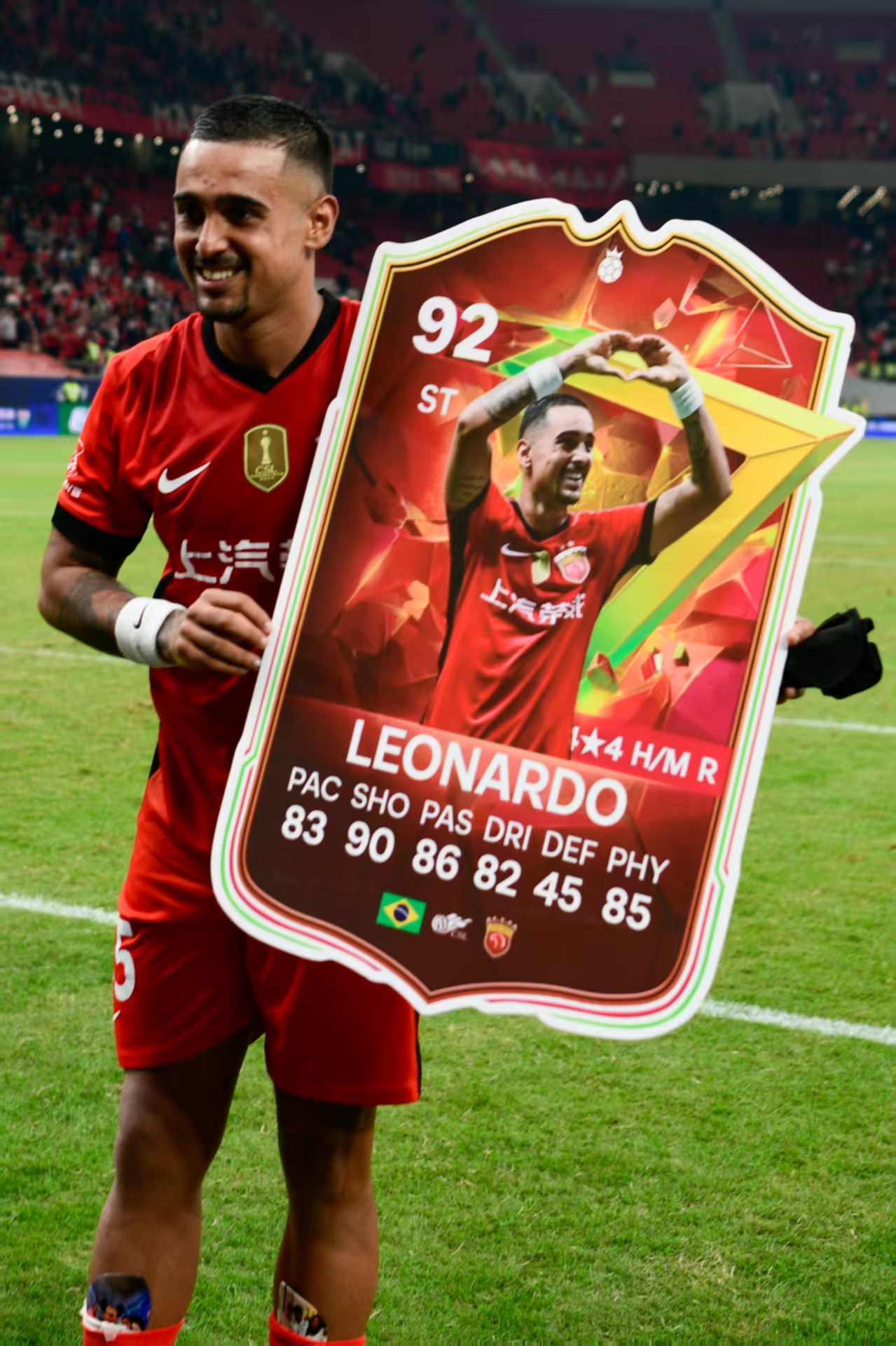带伤出场的莱昂纳多收到球迷送的球星卡。劳动报记者颜筱依 摄影