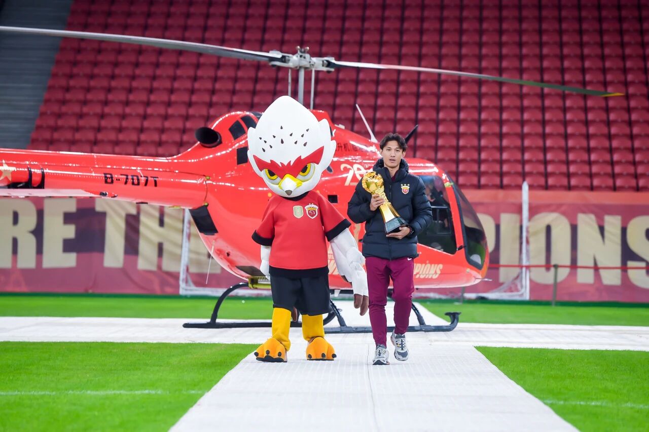 激动人心的夺冠视频过后,大家的目光被静候在内场的临港捷运纪念版直升机吸引,仪式开始前,这架直升机载着队长王燊超和奖杯从川沙飞抵球场。这一环节不仅是荣耀的展示,更是俱乐部积极探索“低空+足球”体旅融合新范式的生动实践。海港俱乐部与临港捷运本赛季已联合推出多次低空游览活动,通过拓展城市空域观赛新场景,延伸球迷体验的维度。未来,双方还将继续推进更多融合项目,共同助力上海低空经济生态的创新。