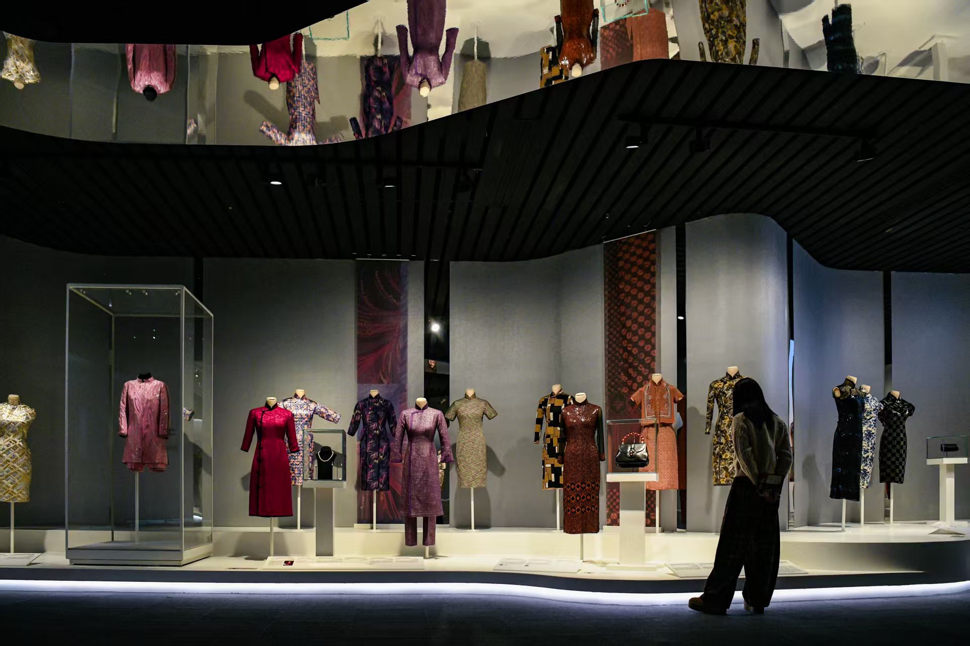 在展陈方式上,本次展览依托上海博物馆自主研发的20世纪历史阶段特殊人台模特外观专利设计,为不同时期的旗袍制作适配人台,力求呈现其最为自然、优美的穿着状态。在裸展区域,观众可近距离观察服装结构与工艺细节。