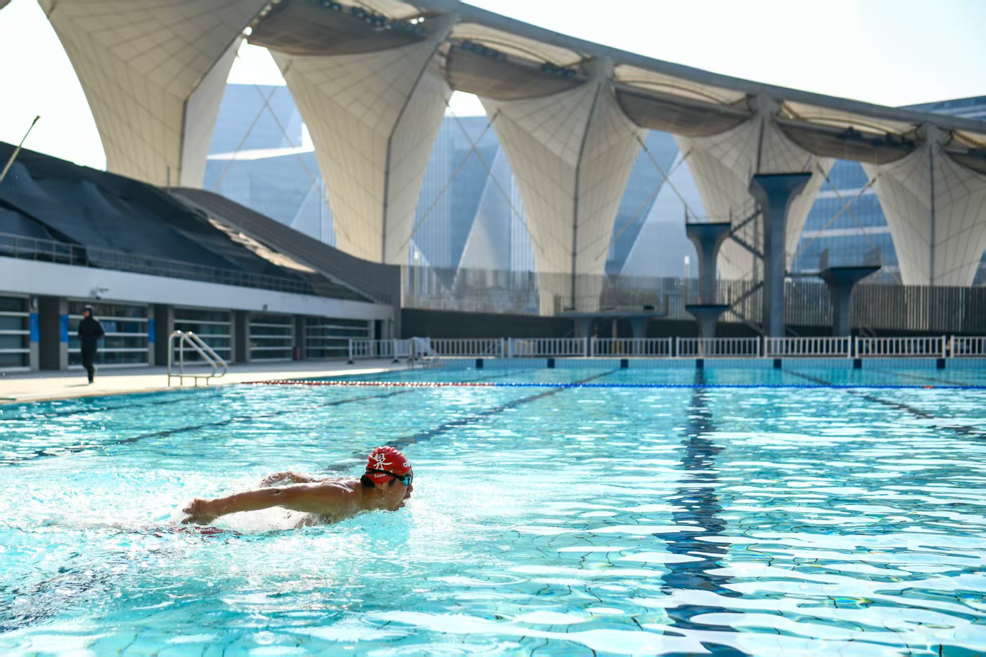 在东方体育中心室外跳水池月亮湾,冬泳爱好者们扑通扑通往泳池里跳,不畏寒冷,挑战自我,感受着冬泳带来的乐趣。