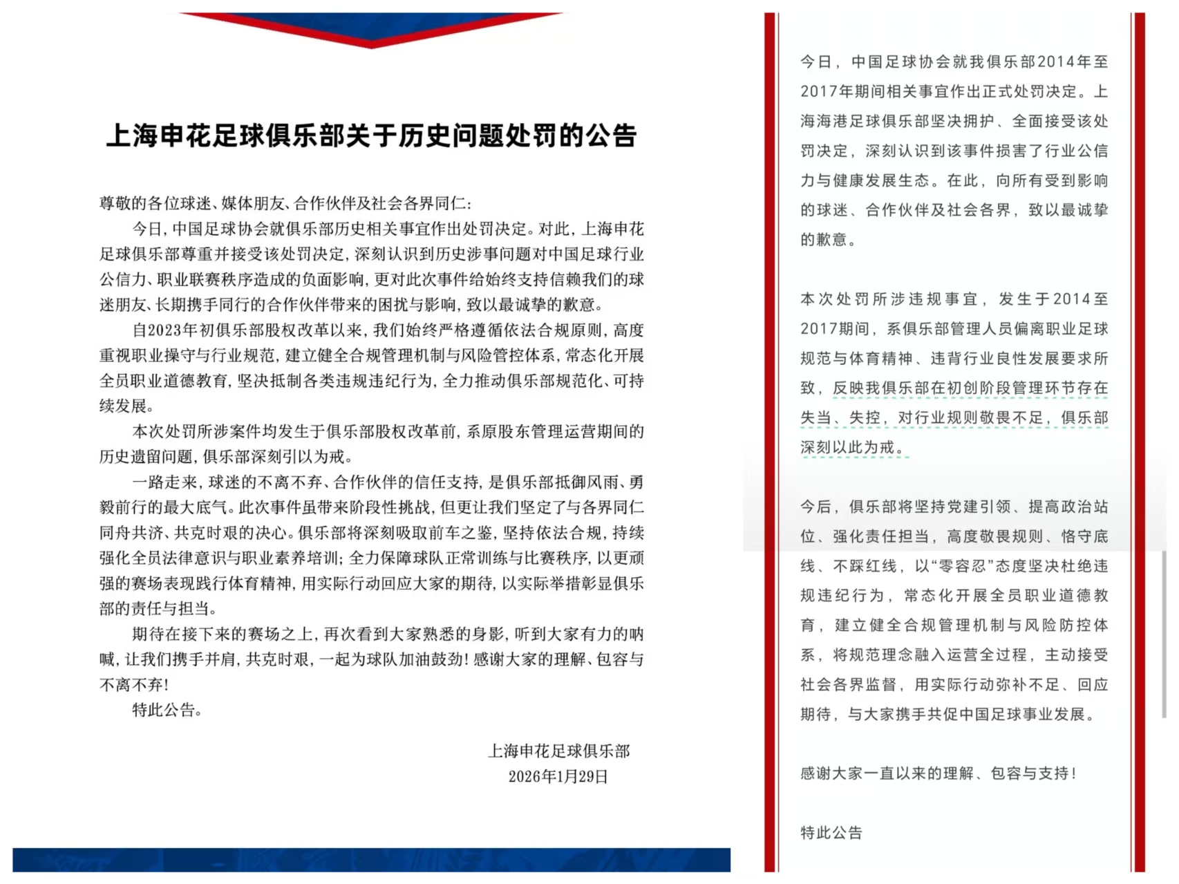 头图为申花和海港两家俱乐部官方声明。官方俱乐部截图