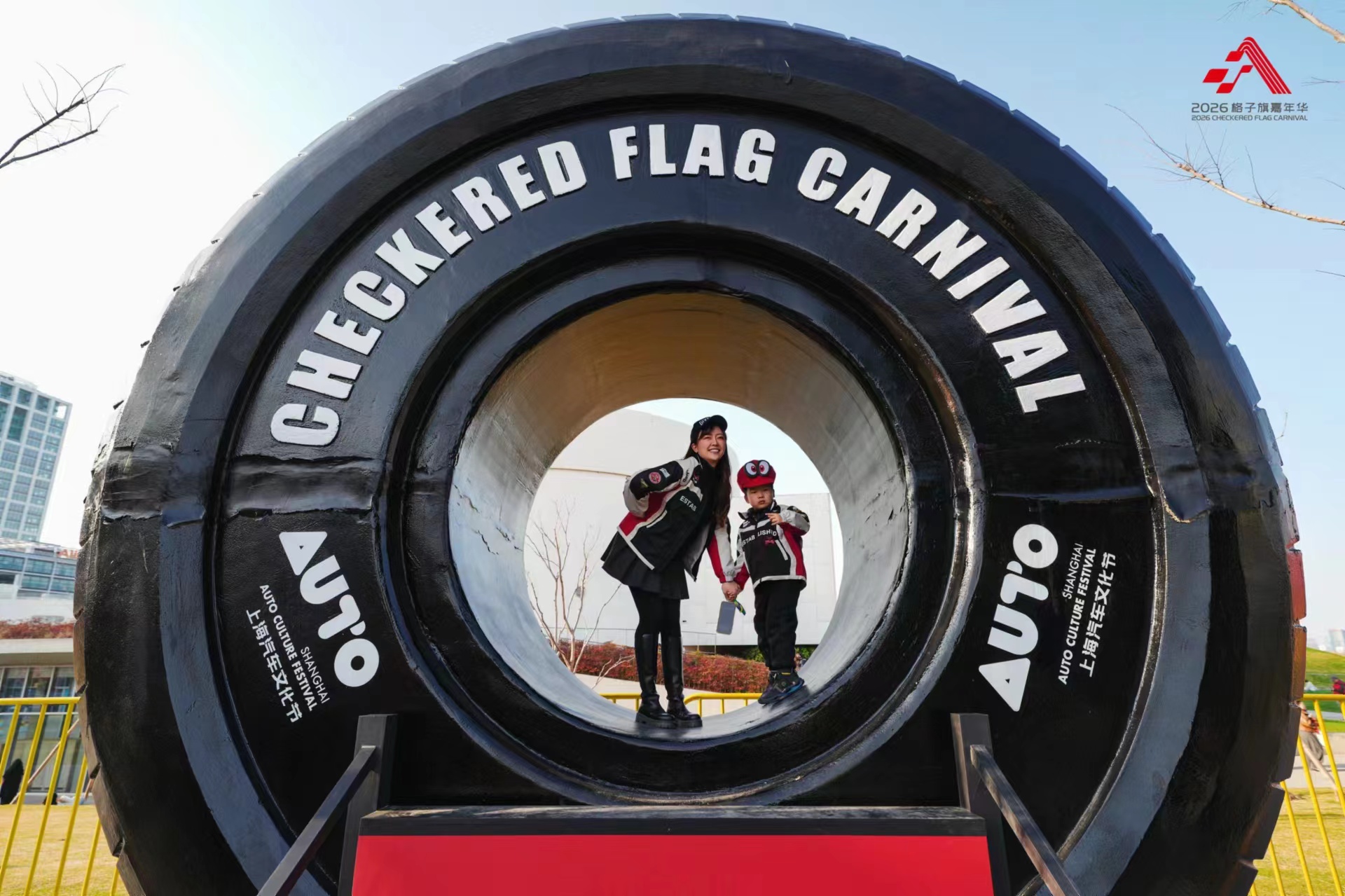 一对车迷母子在巨型轮胎装置里打卡拍照。主办方供图