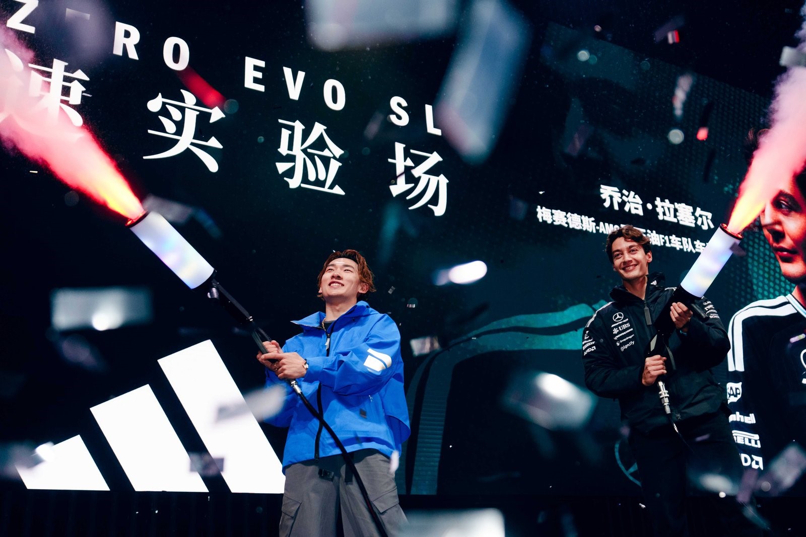 F1车手、上周刚刚夺得澳大利亚站冠军的拉塞尔与两届冬奥会单板滑雪冠军苏翊鸣破圈联动,驾驶AMG跑车以标志性“甜甜圈”漂移震撼开场,用引擎转速与轰鸣点燃全场脉搏;在运动员领跑百名精英跑者开启3公里的主题冲刺中,跑者实时心率与步频联动现场灯光与音乐,成为一场集体的“速度”艺术共创;在“竞速美学音乐舞台”,先锋音乐人窦靖童则以速度为灵感创作的原创音乐作品迎来全球首演。